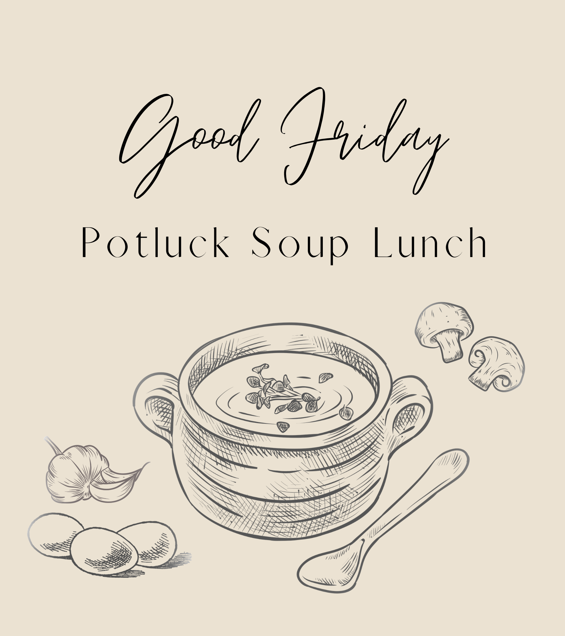 Following our Good Friday worship service, we’ll be hosting our traditional community potluck soup lunch at 12:00pm.